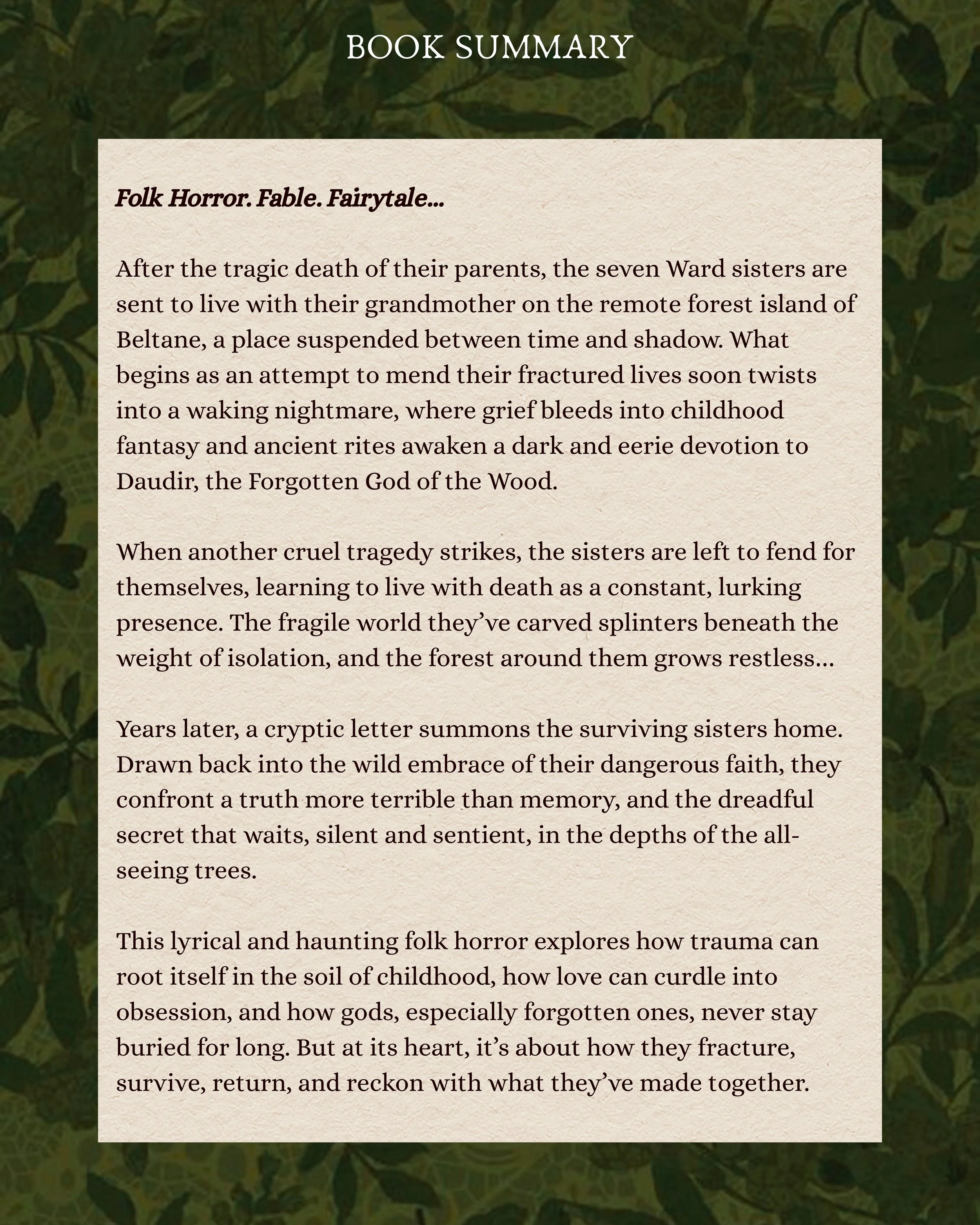 “A sensory fever dream that’s like Yellowjackets meets We Have Always Lived in the Castle. This is easily my favourite Dawn Kurtagich book yet—a piercingly emotional and atmospheric folk horror that perfectly captures the love and ache of sisterhood. This story crawled inside me and took root, and I’m certain it will never let go.”